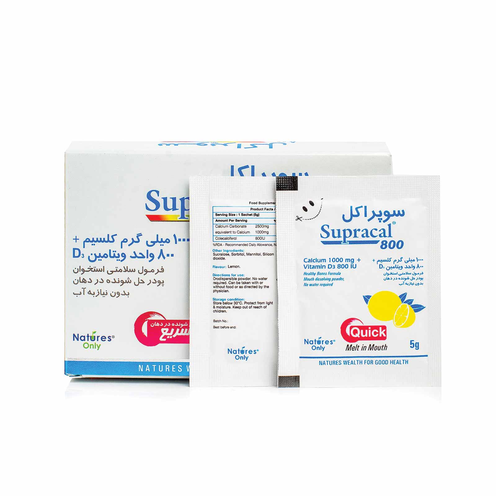کلسیم، فراوان ترین مینرال موجود در بدن است. بدن هر فرد تقریباً ۱ کیلوگرم کلسیم دارد. مسلما در افراد مختلف با نوع استخوان بندی متفاوت، این میزان فرق می کند. بیشتر کلسیم در استخوان ها و دندان ها موجود است و تنها ۱% آن در بقیه بدن وجود دارد که همین ۱ درصد اعمال زیادی انجام می دهد، مثلاً انقباض همه ماهیچه های ما بسته به وجود کلسیم است. پودر سوپراکل ۸۰۰ نیچرز اونلی دارای ۱۰۰۰ میلی گرم کلسیم و ۸۰۰ واحد ویتامین D۳ می باشد که در هر ساشه و به صورت پودر قابل حل در دهان عرضه شده است.